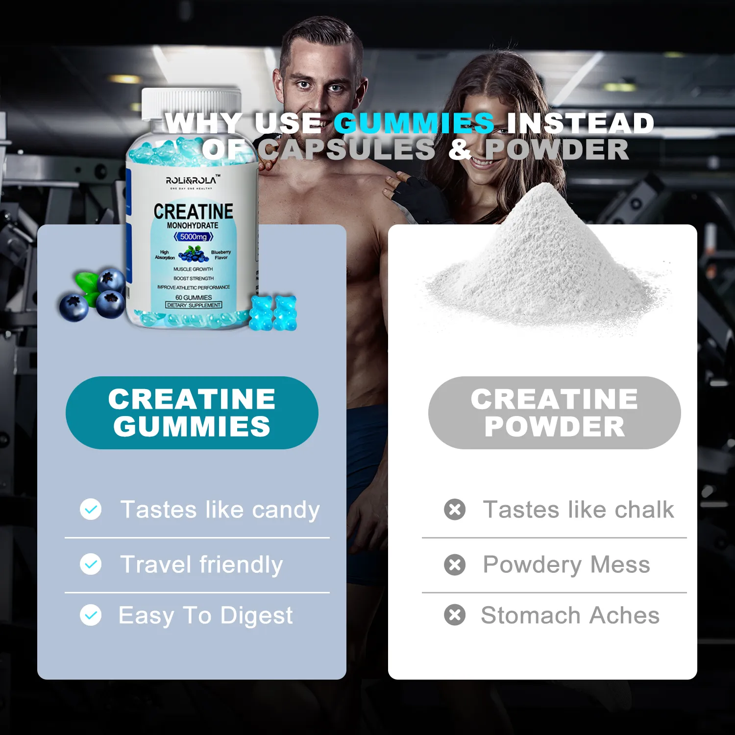 Delicious Taste: The blueberry-flavored gummies provide a tasty way to consume creatine, making it more enjoyable, especially for those who dislike traditional powder or capsule forms. Efficient Absorption: Gummies can be quickly absorbed through the oral mucosa, increasing the bioavailability of creatine and helping users achieve energy boosts and muscle enhancement more rapidly. High-Quality Ingredients: Made with high-quality creatine monohydrate, ensuring purity and safety without artificial colors or additives, making it suitable for long-term use.